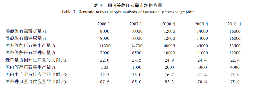 由于國(guó)內(nèi)眾多炭素企業(yè)看到等靜壓石墨依賴(lài)進(jìn)口的局面。近幾年來(lái),掀起了一股研制和生產(chǎn)等靜壓石墨的熱潮,國(guó)產(chǎn)等靜壓石墨的供應(yīng)量將不斷增加,但近幾年仍然以進(jìn)口為主。目前國(guó)內(nèi)市場(chǎng)集中在低端等靜壓石墨制品,而且有一哄而上的局面,和中國(guó)大量上多晶硅項(xiàng)目非常相似,極有可能造成產(chǎn)能過(guò)剩惡性競(jìng)爭(zhēng)局面,所以應(yīng)該把精力放在高端等靜壓制品上面,向國(guó)外先進(jìn)水平看齊。表3 為2006 年以來(lái)國(guó)內(nèi)等靜壓石墨的市場(chǎng)供應(yīng)量。